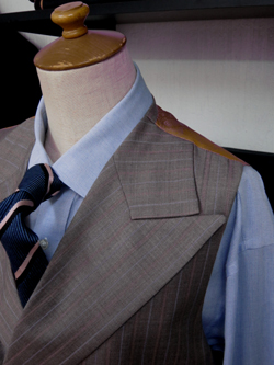 御来店いただいて見本スーツを見せて痛きました | 神田のヨシムラさんで作られたコンケーブドショルダースーツ ヨシムラさんの社長とは一度御会いしてるので ヨシムラさんのスーツを見せて頂くのは楽しみでした 仮縫い無しで これだけの御注文箇所をクリアーしてるのは ヨシムラさんの仕事は素晴らしいと思いました 私も頑張ってコンケープドショルダースーツに挑戦なのですが、、、