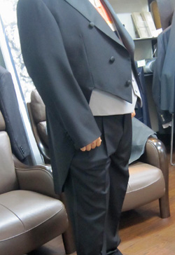 燕尾服の着丈も好い感じの所に来ています ベストと上着のバランスも綺麗に出ましたし 背中もフロントも綺麗なラインが出てくれました 袖と股下チョイ長が目ですが 袖は腕をチョット上げたら良いですし サスペンダーをしますので、こちらも大丈夫でしょう
