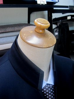 店にあったマオカラージャケット見本を見て頂いて 裾が燕尾のようになった形を望まれました 素材はカノニコ ブラック素材 マオカラースーツ ¥64.000− フロントヒヨク ¥3.000− オプsトン料金です